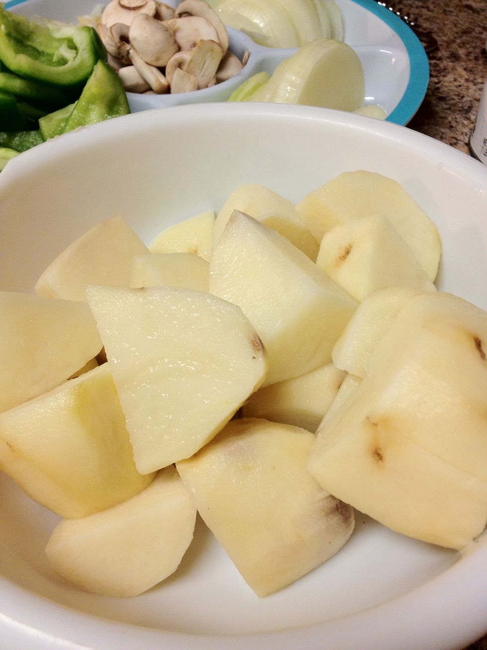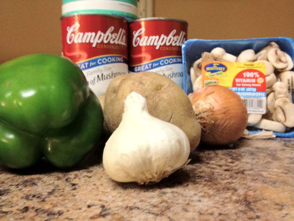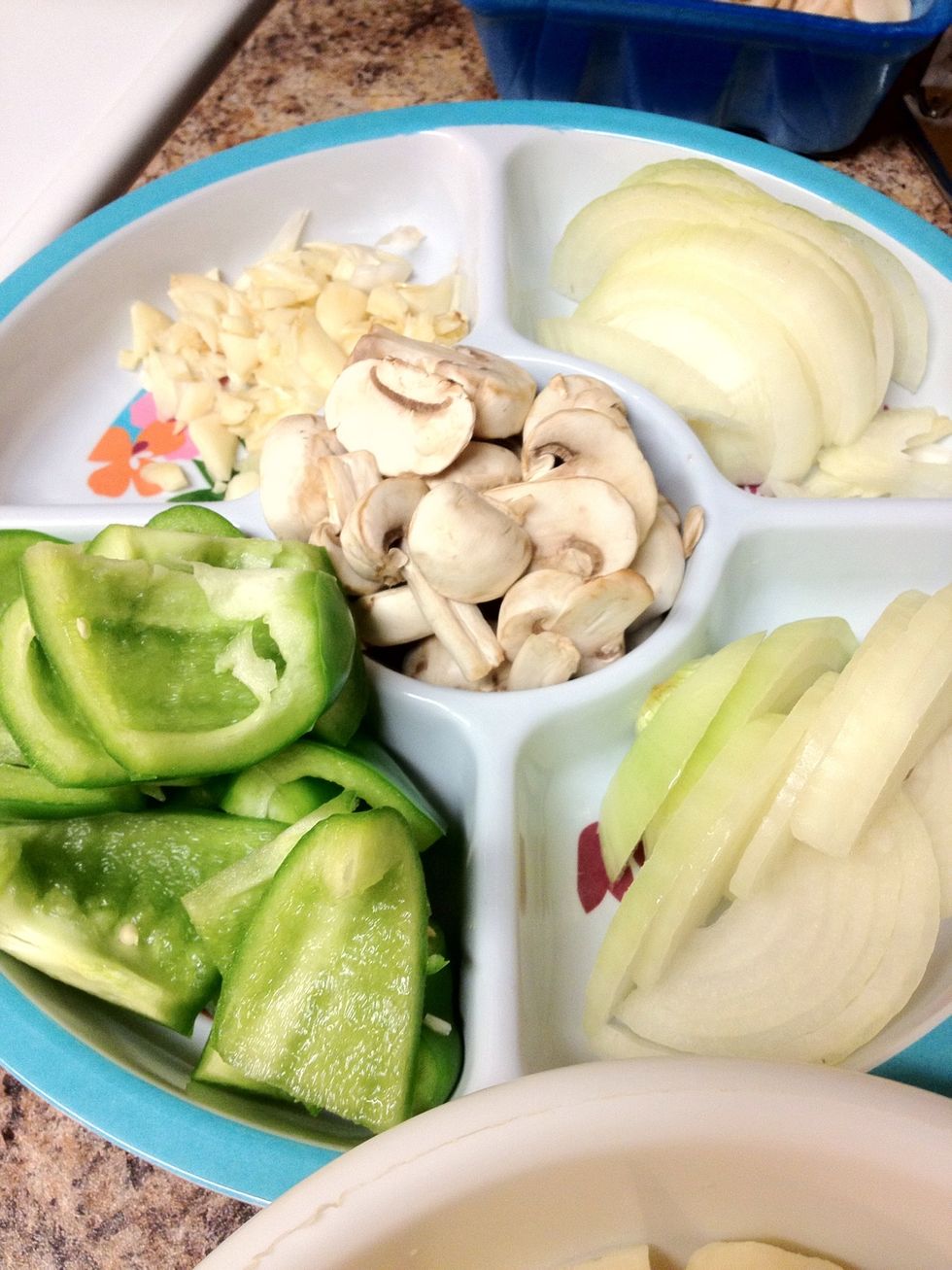 Gather all of your ingredients. Then start chopping up your vegetables. Mince the garlic. Slice your onions, bell pepper, and chop your potatoes in cubes