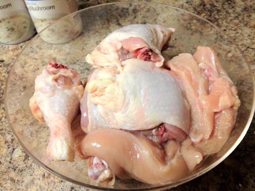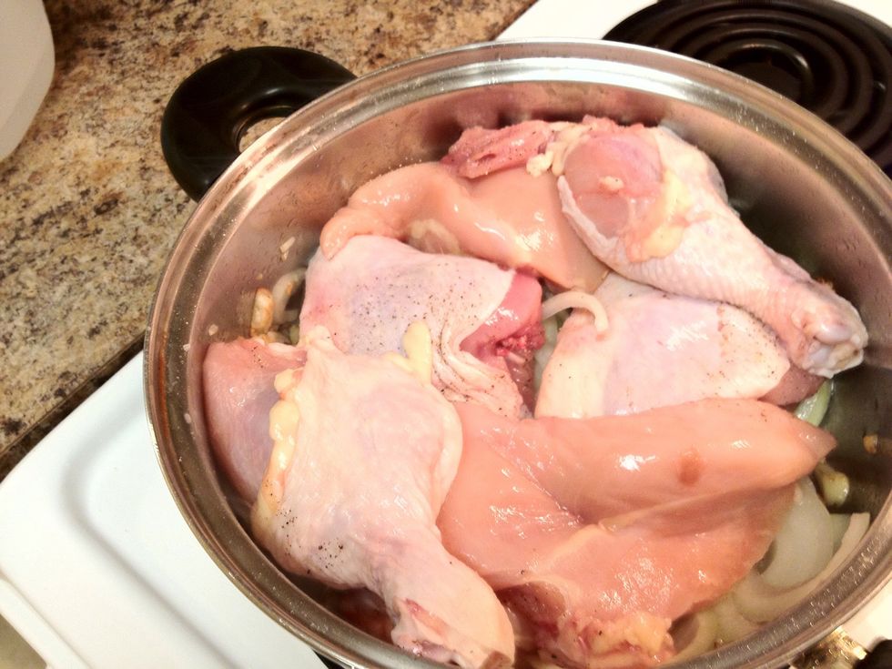 You can use any part of the chicken that you prefer. Today I used some chicken thighs and legs. Chop chicken if needed then add a pinch of salt and pepper for taste.