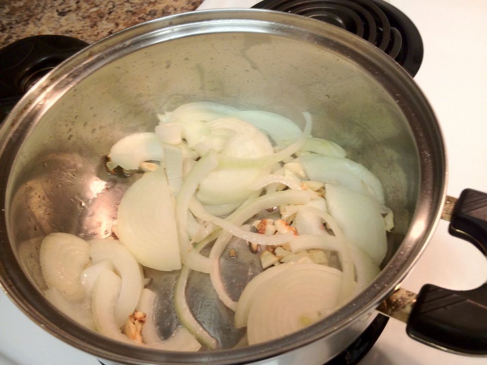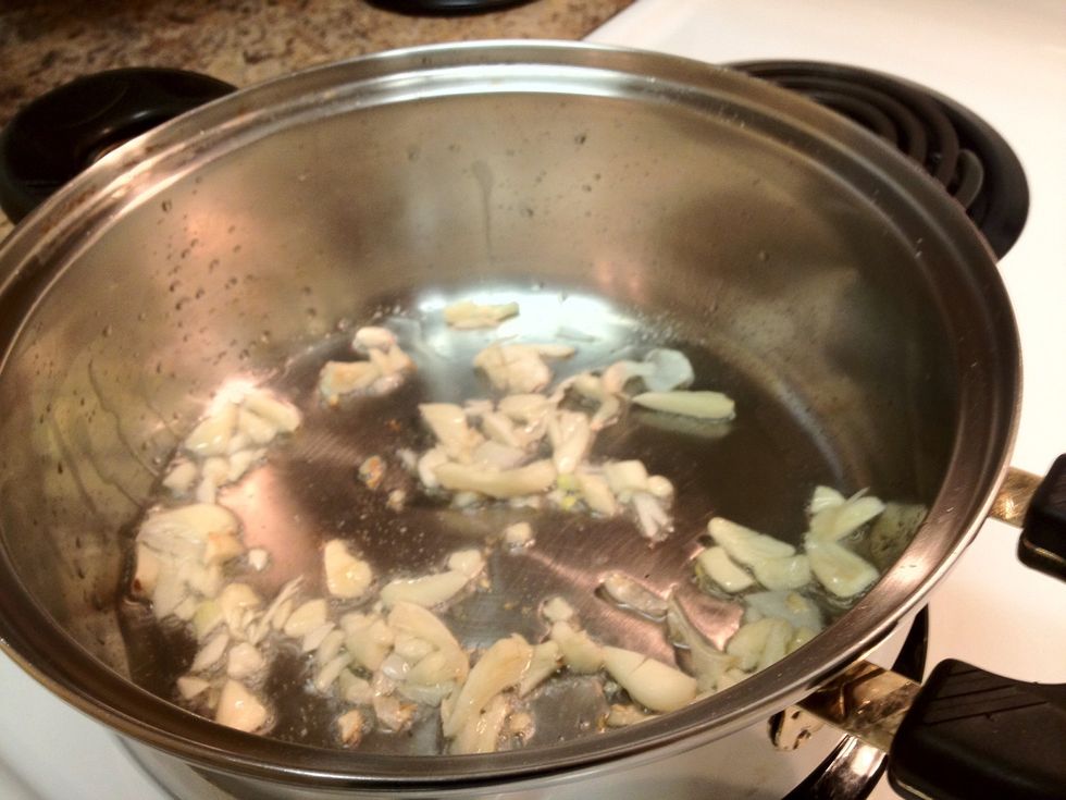 Heat a pan or pot then add some oil. I used canola oil. Then add garlic, wait til golden brown then add your onions. Sauté for a few minutes then add your chicken.