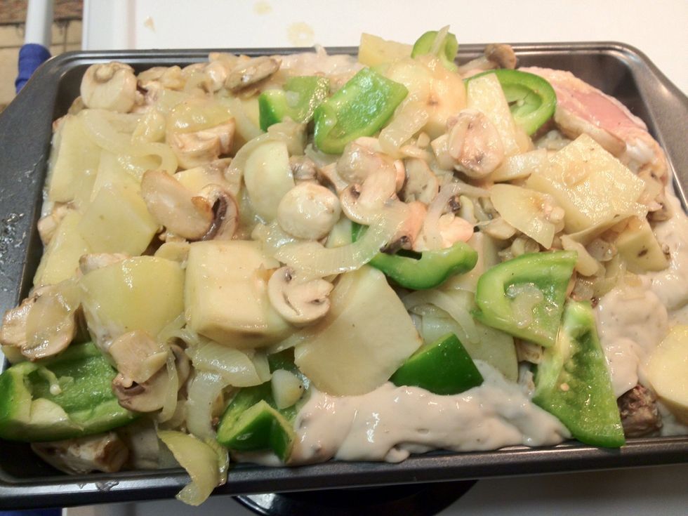 Get you pan ready. Lay out chicken at the bottom. Then add your vegetables. On top pour your cream of mushroom soup and spread evenly to cover the entire pan.