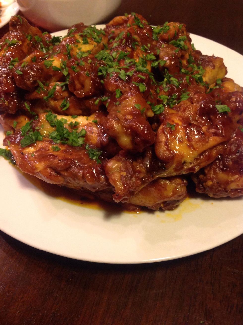 Marinate the wings, whit white wine, soy sauce, chili powder, vinegar, salt and pepper and oil, pre heat the oven 350, and let them cook for 20 min