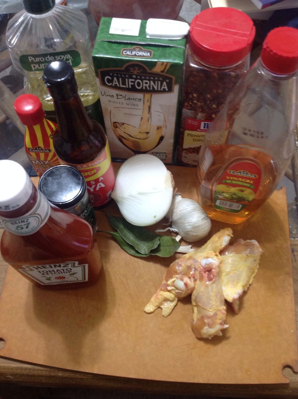Marinate the wings, whit white wine, soy sauce, chili powder, vinegar, salt and pepper and oil, pre heat the oven 350, and let them cook for 20 min