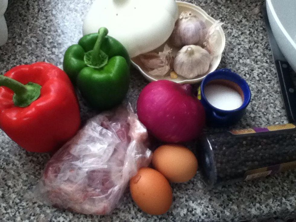 Ingredients: two garlic, two eggs, onion, meat (beef or chicken), pepper, salt, oil, one sweet red pepper & one sweet green pepper.