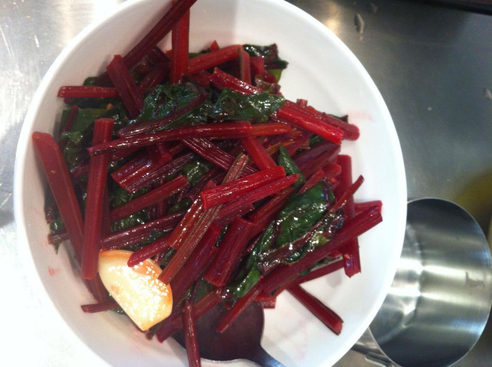 Add beetroot, stalk bits on bottom and leaves on top. Season with salt and pepper.