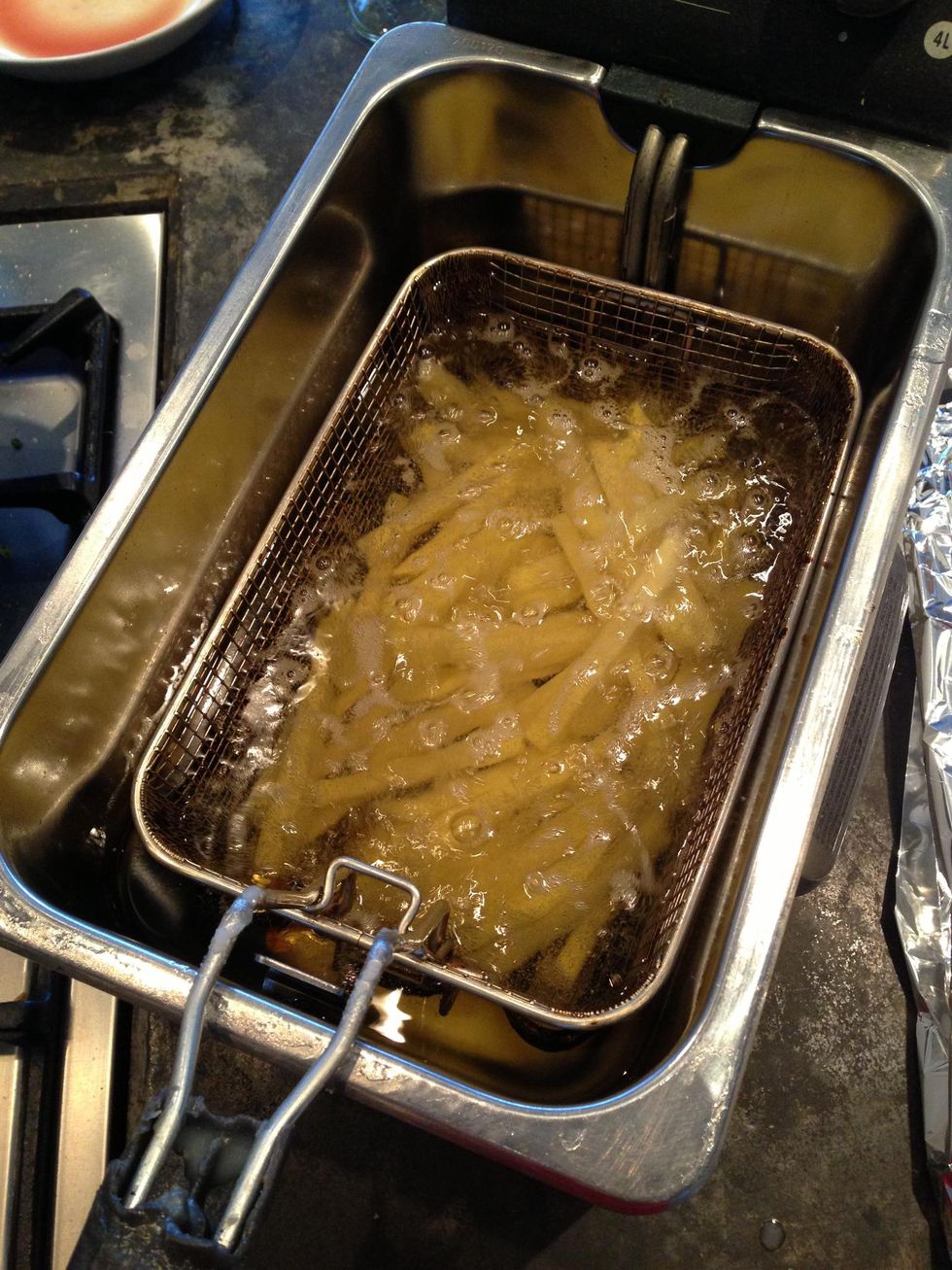 Cut the potatoes into fries. Belgian fries are 10mm or thicker. I use a device like this, but you can also cut with a kitchen knife.
