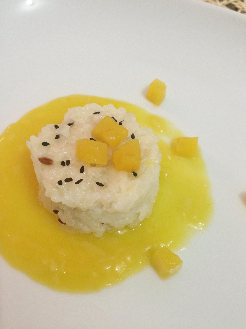 Here's the finished product, with mango puree, garnished with toasted black sesame and diced mangoes.