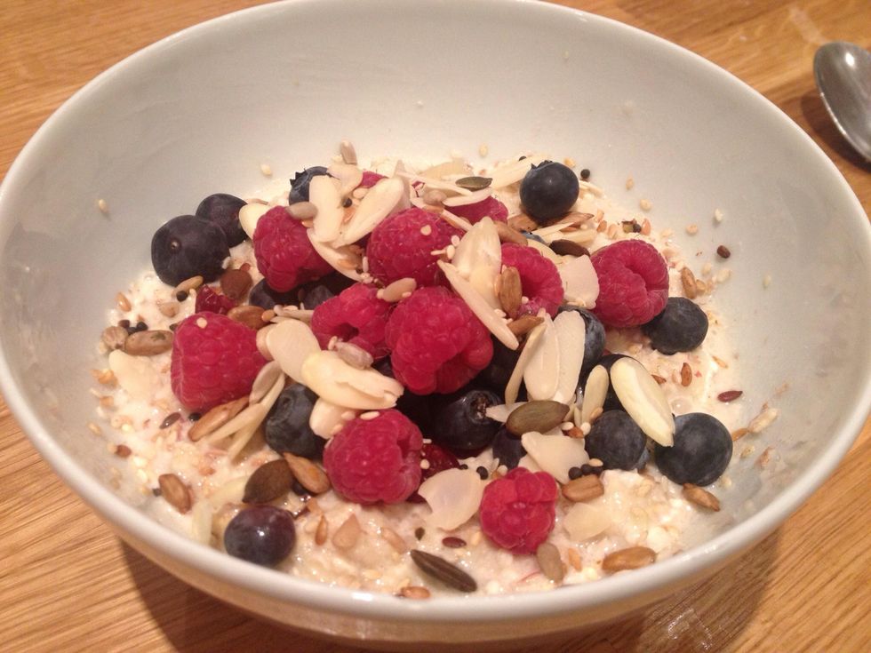 This is a great, tasty and healthy breakfast and my take on Bircher museli. You need to soak the oats overnight so start the day before you want to eat it.
