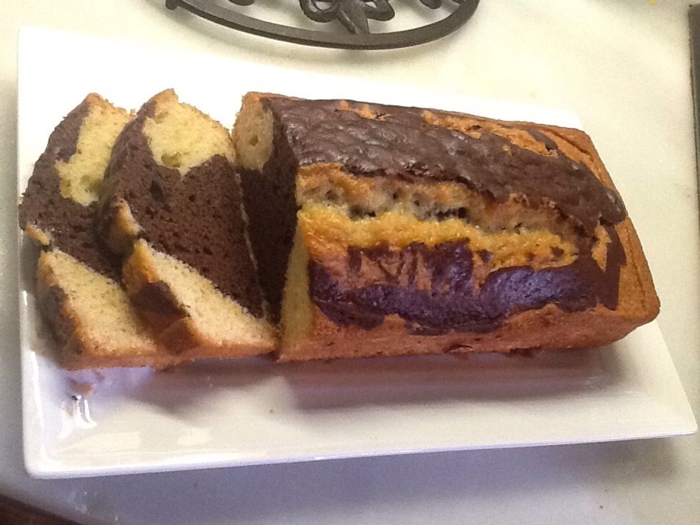 Para hacerlo marmolado, se añade a la mitad de la masa unas cucharadas de chocolate en polvo. Se vierte en el molde el blanco y luego el negro en el centro. Esto hará que suba una vez toque el fondo.