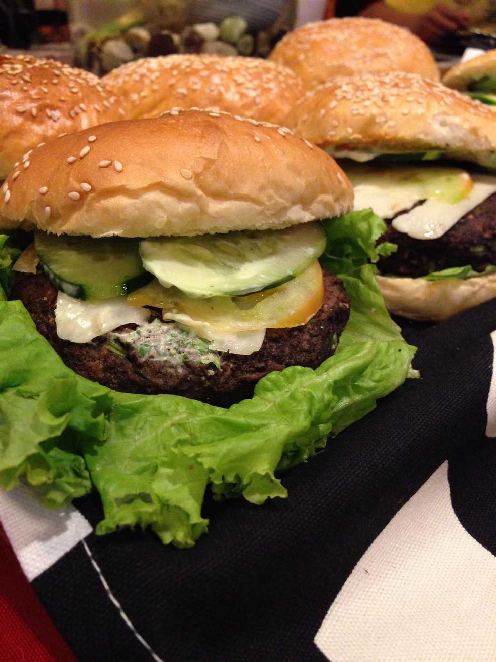prepare your burger the regular way (catsup, mayo, mustard, pickles) or the way you want it... on this picture for my dressing i used yogurt, coriander and lemon, lettuce, tomato and cucumber...