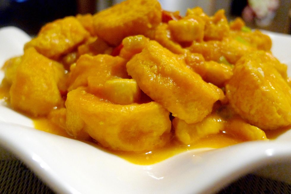 Then in the same wok, briefly fry the fresh pumpkin cubes. Drain and set aside.