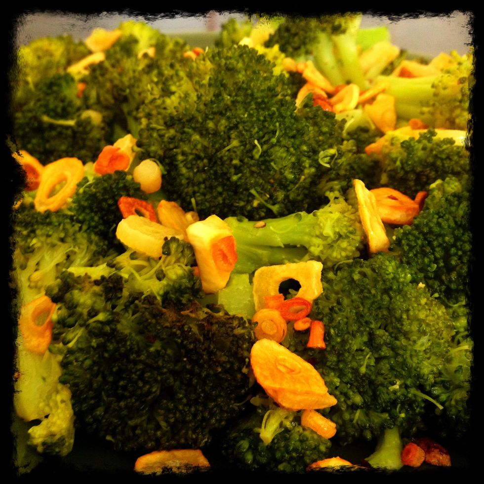 Remove the broccoli from the steamer. Pat it dry. Add it to the pan with the olive oil and sauté for about 3 minutes.