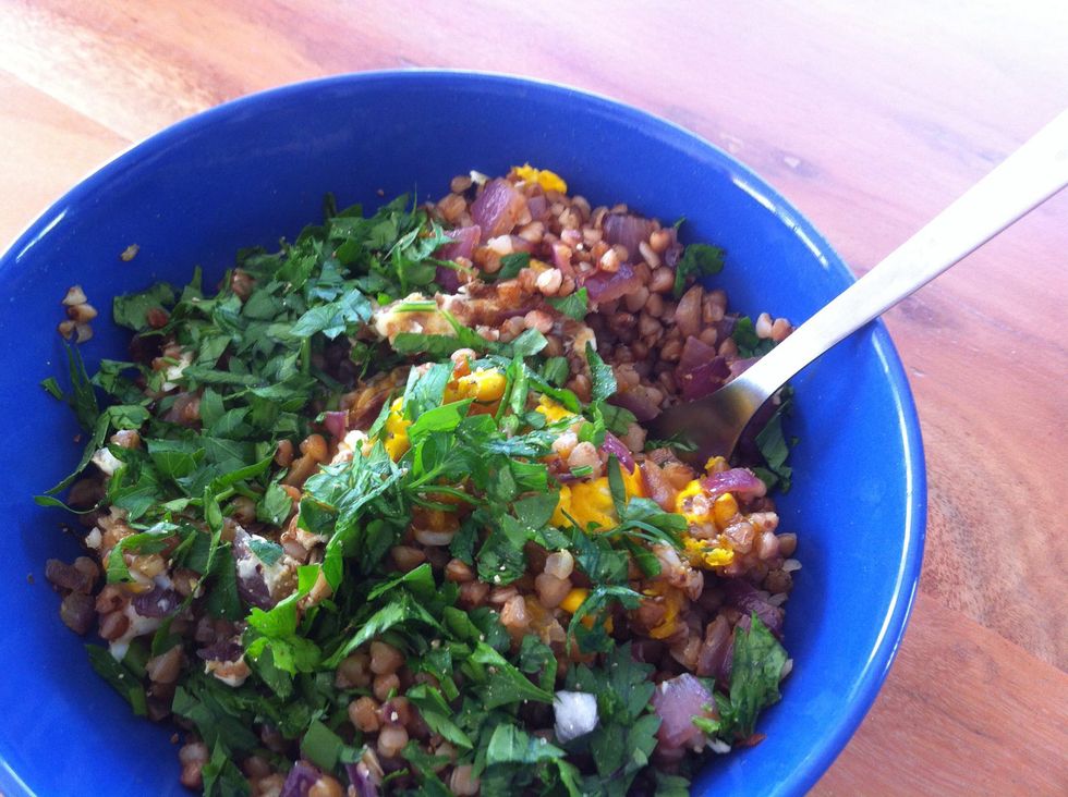 Add the cooked buckwheat to the onion and stir. This amount makes two generous servings. If you are eating on your own, add half the buckwheat and save the other half in the fridge for later.