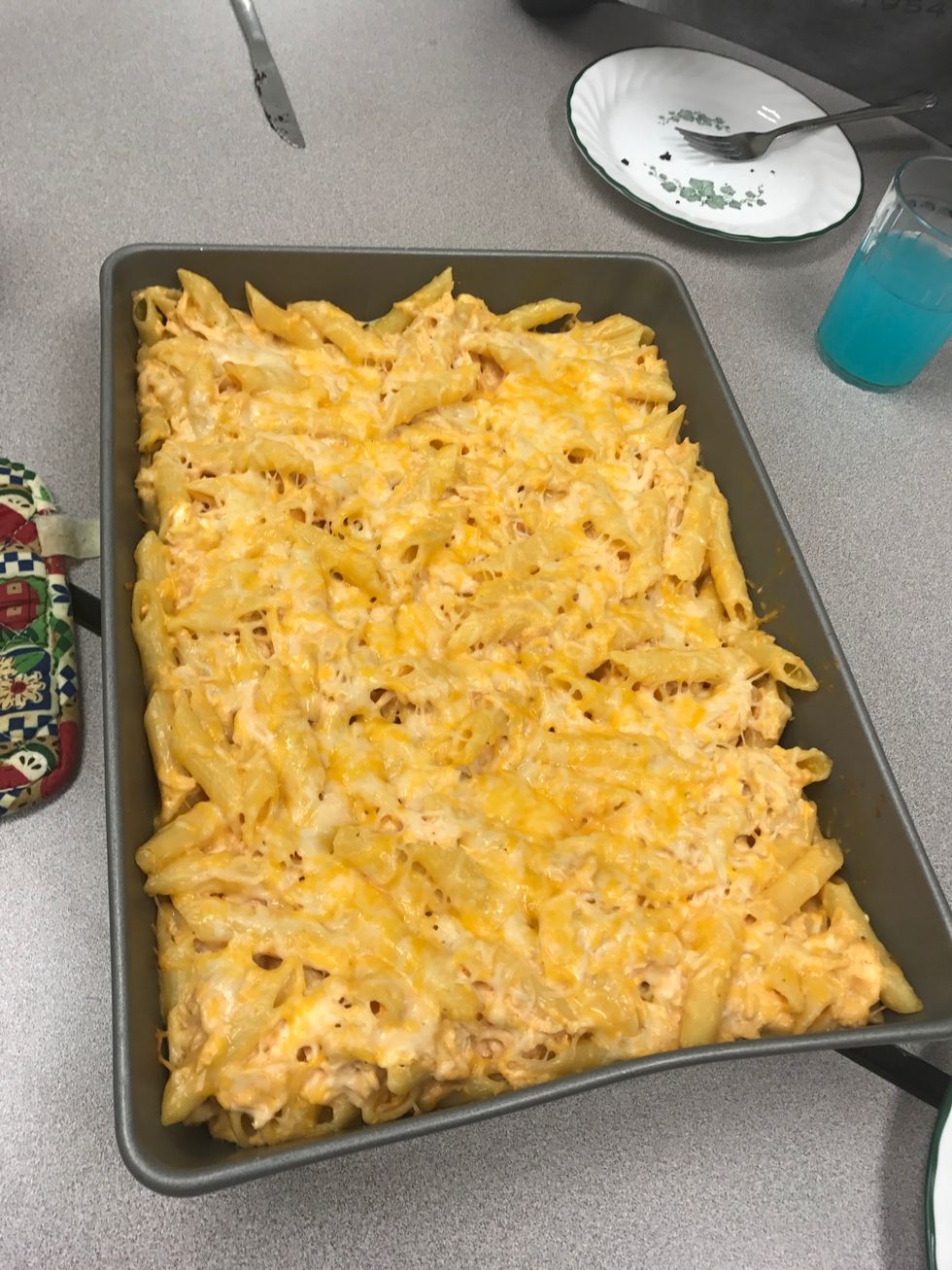 Mix 1-8 ounce package of cream cheese softened, 3/4 cup ranch dressing, 1/3 cup hot sauce, 2 cups shredded cooked chicken, 1/2 cup mozzarella cheese and cooked pasta noodles together