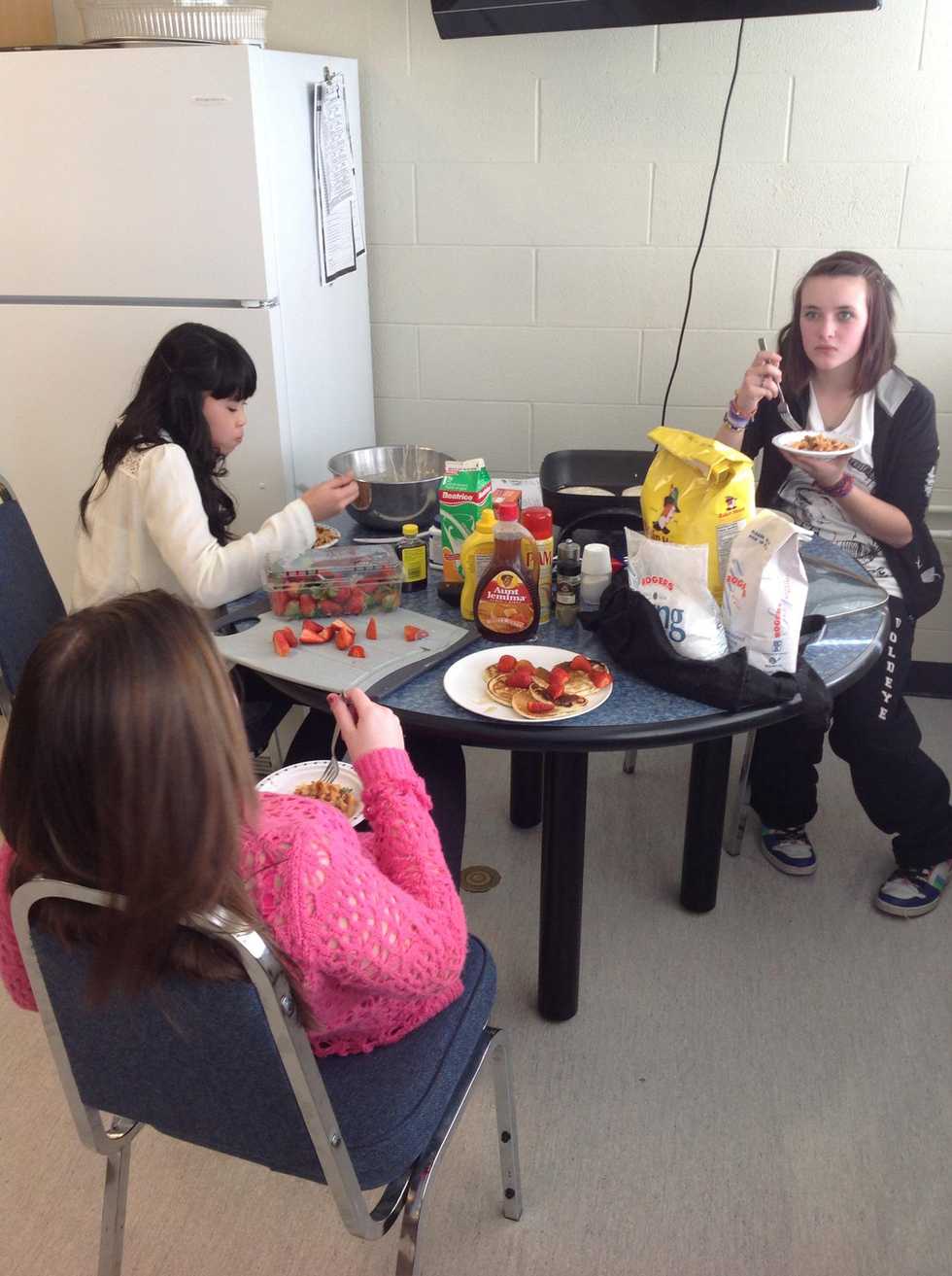 put the pancake mix into the little bowl and put them into the burner and keep them on it until they are light brown on the front and back.