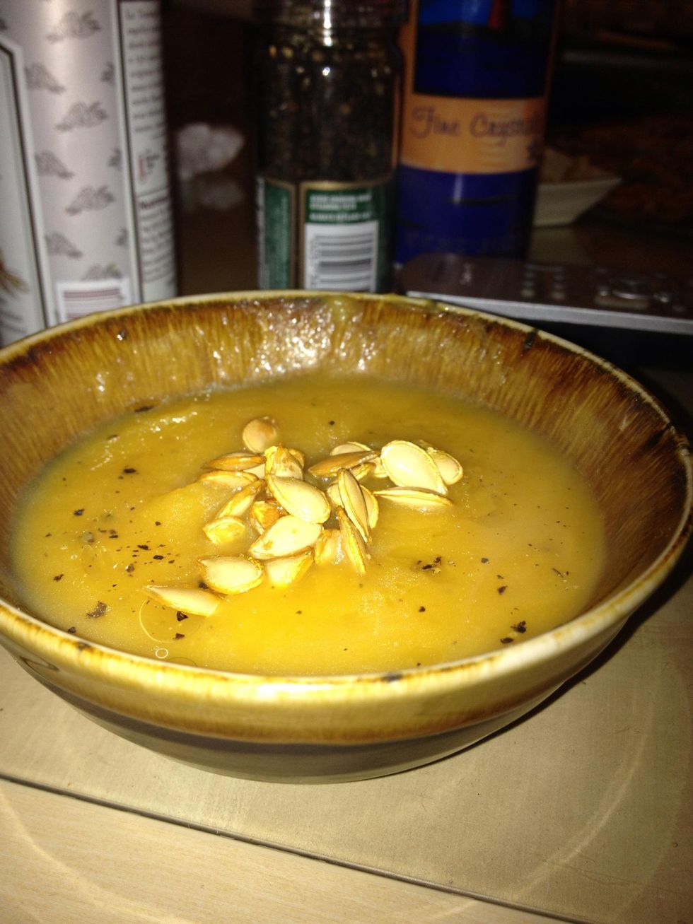 Top with toasted seeds and serve with a nice grilled cheese sandwich. Good appetite!