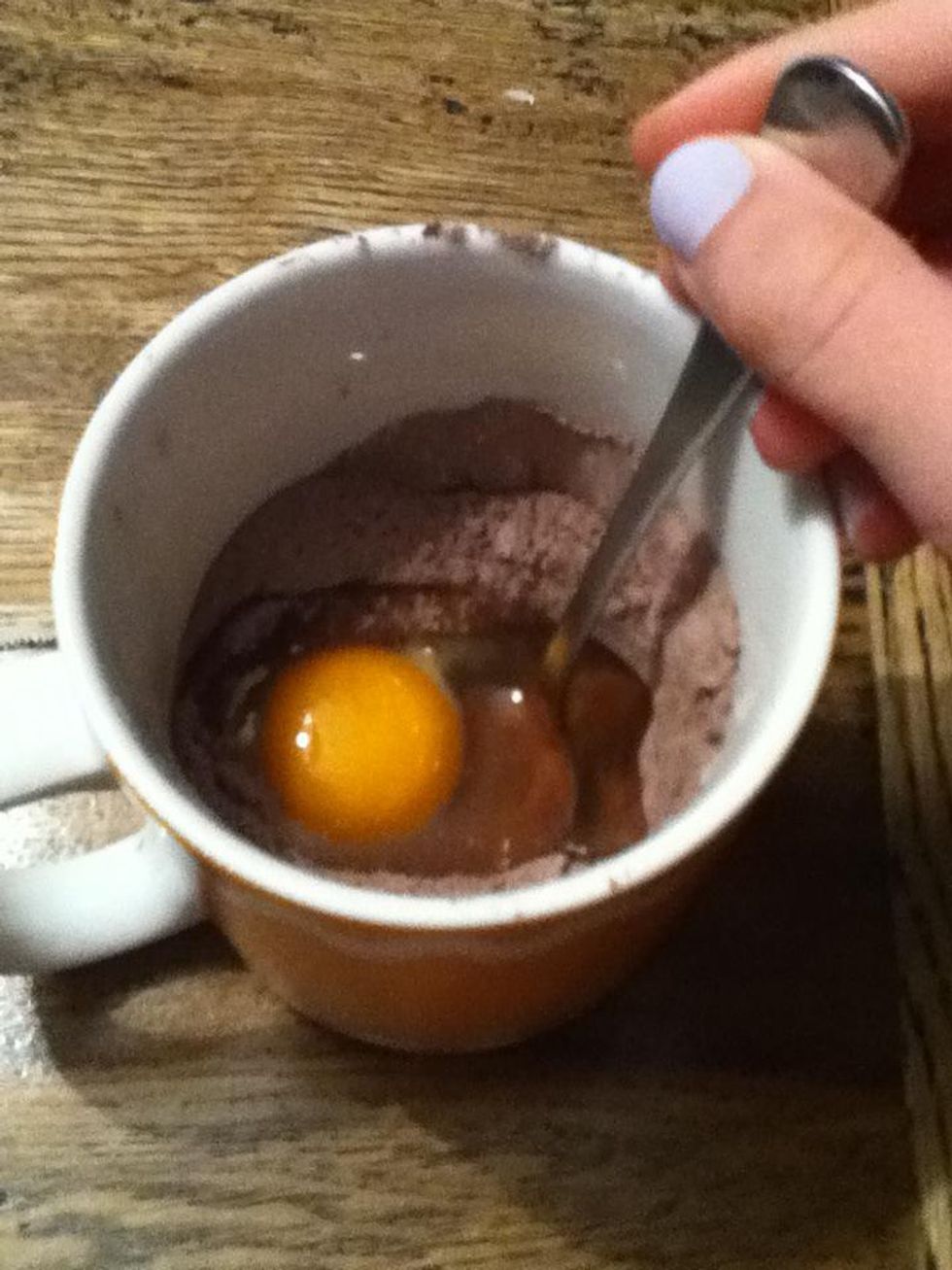 Now pour all those ingredients into your mug and mix well! So now you have a nice looking little mix of chocolate batter...⬆