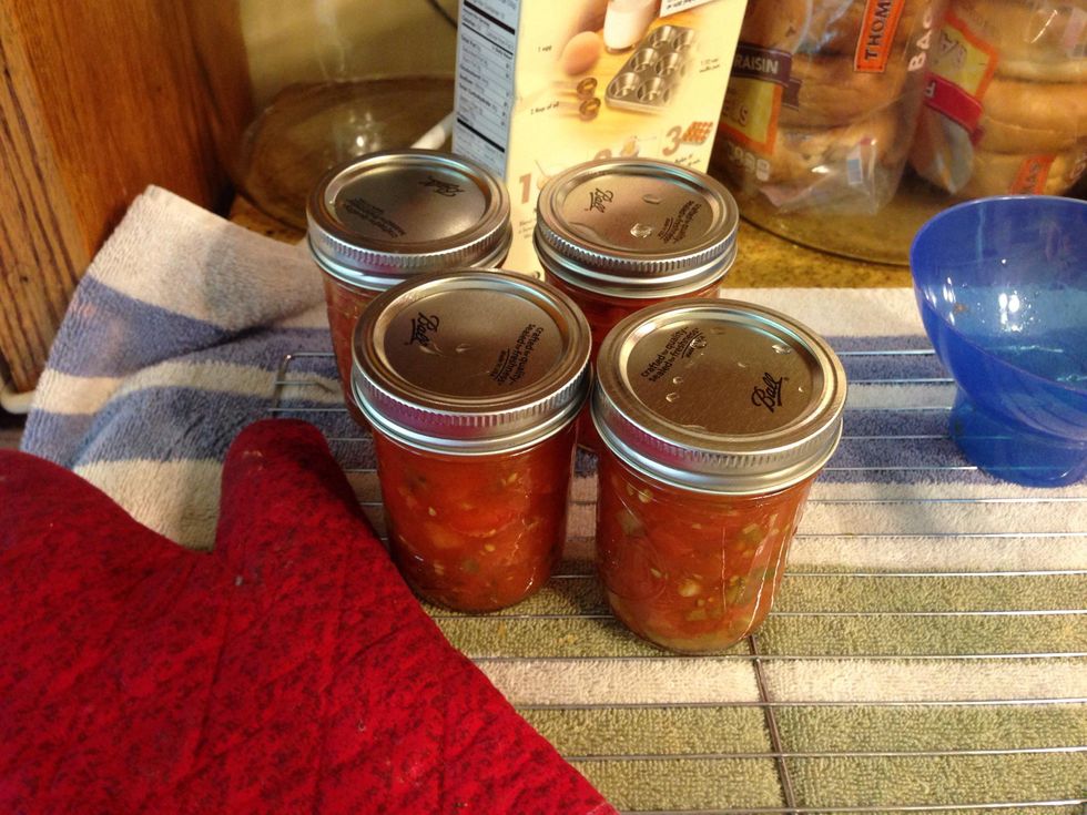 Remove jars & cool. Check lids for seal after 24 hrs. Lid should not flex up & down when center is processed. Always have extra jars because u might end up w/ more than u anticipate. had total 6 jars