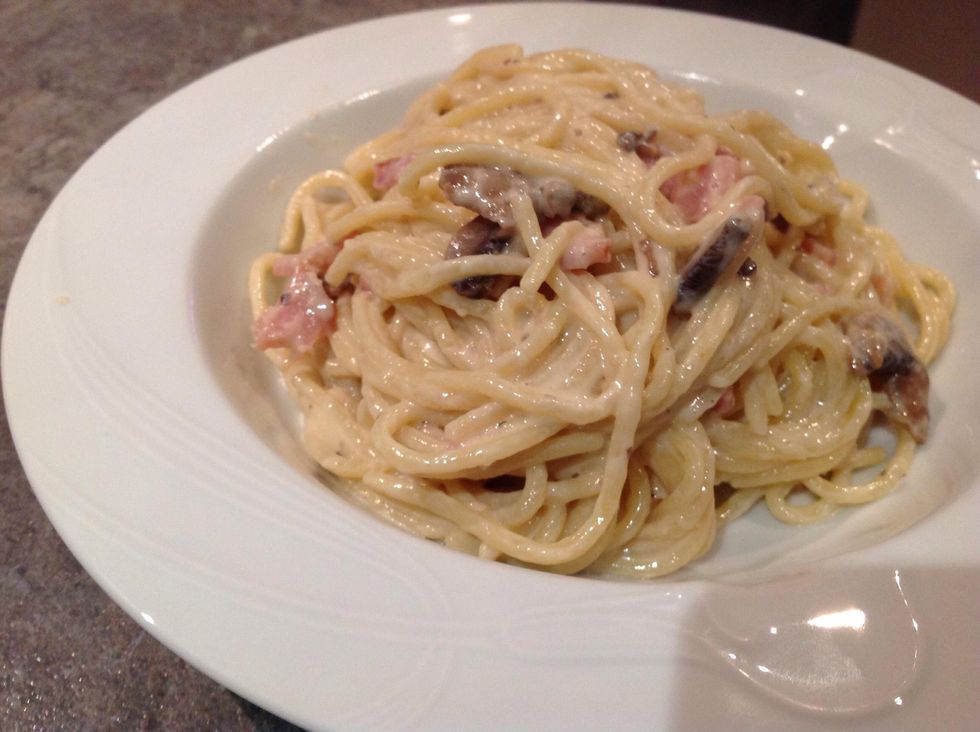 Once the bacon is cooked add mushrooms and cream and set heat to simmer