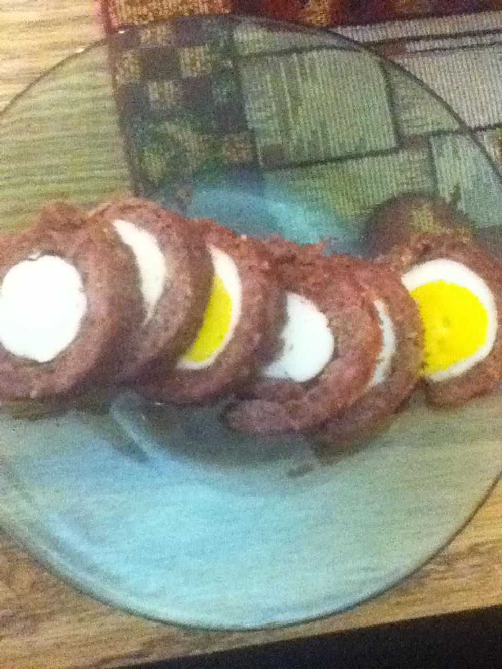 Boil the eggs until they are nice and hard. Peel them and put them on one side of the ground beef