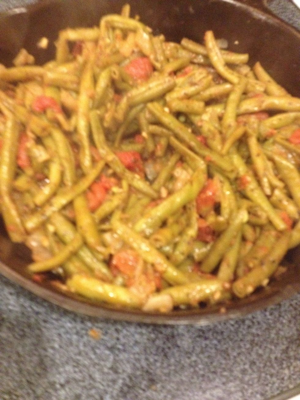 Add canned tomatoes, green beans, herbs, spices and garlic. Add olives if you chose to. (Olive Are great in this. I just didn't have any today!)