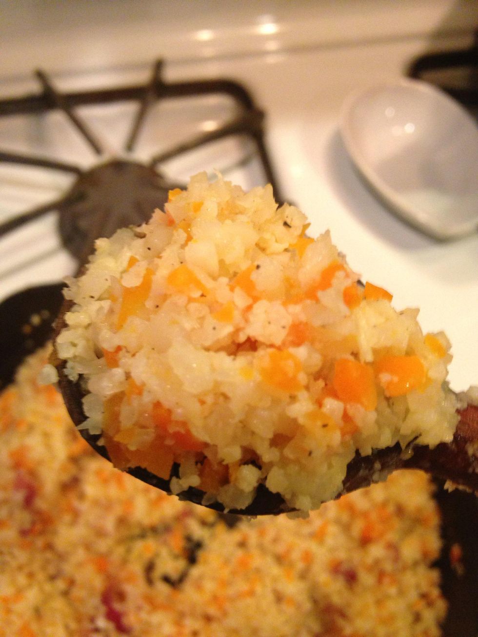 Now, stir in the "rice" and carrots until coated in the butter.