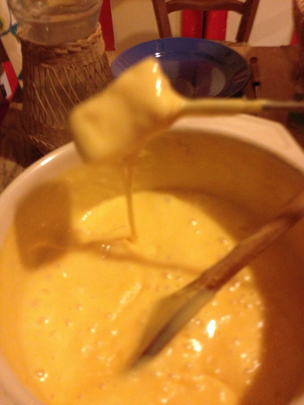 Remove the pot from the heat and place it on the stove. Place grilled after the picnic fondue and dip the bread in the cheese. Remove the piece of bread and eat it with a fork.