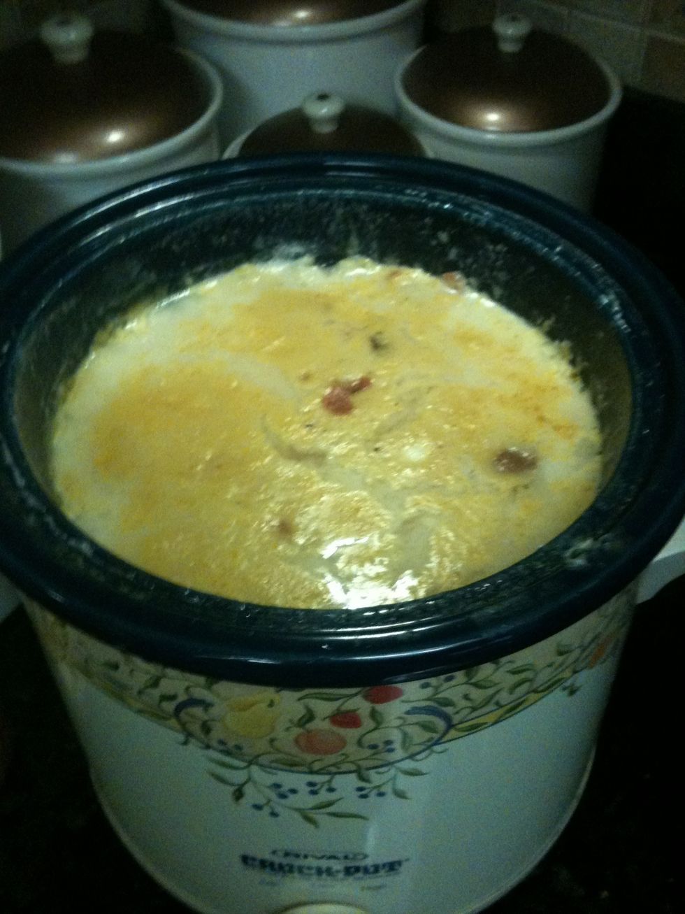 After 4 hours add velveeta cut into cubes!! Stir every 10 min untill cheese is melted!!