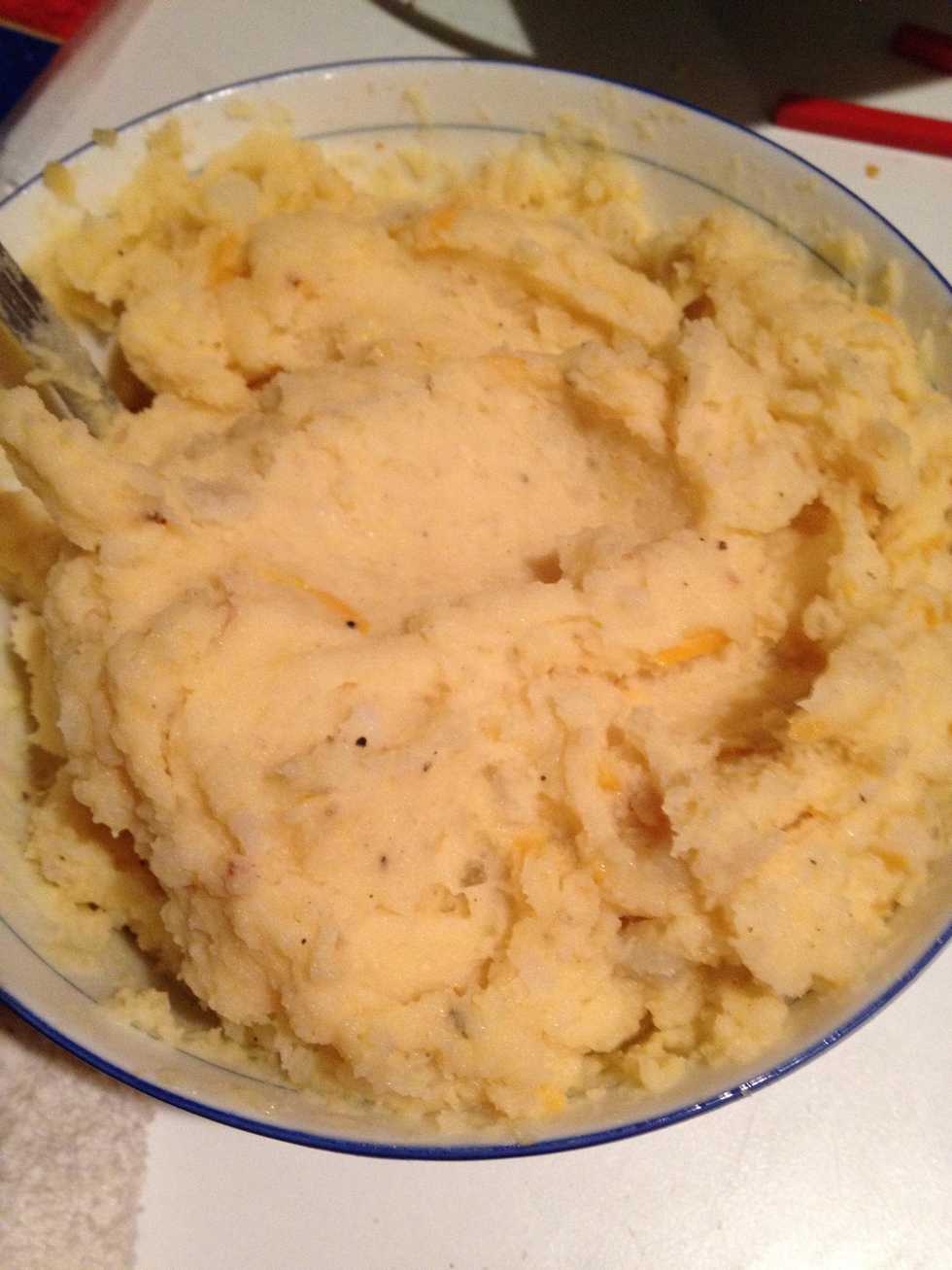 Took potatoes out & just quickly put them onto of butter. Then added shredded cheddar, parmesan cheese, black pepper, & pepper flakes.