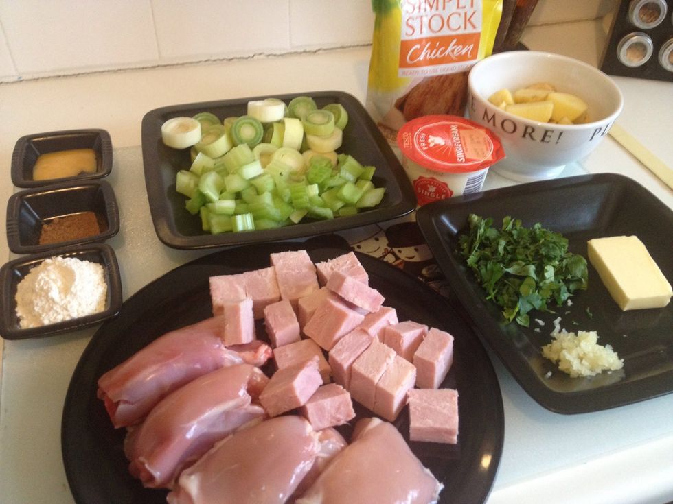 Put chicken, stock, cream, celery, leeks, potatoes, garlic and ham to a large pan. Bring to the boil, reduce the heat, cover and simmer for about 20-25 mins until chicken is tender.