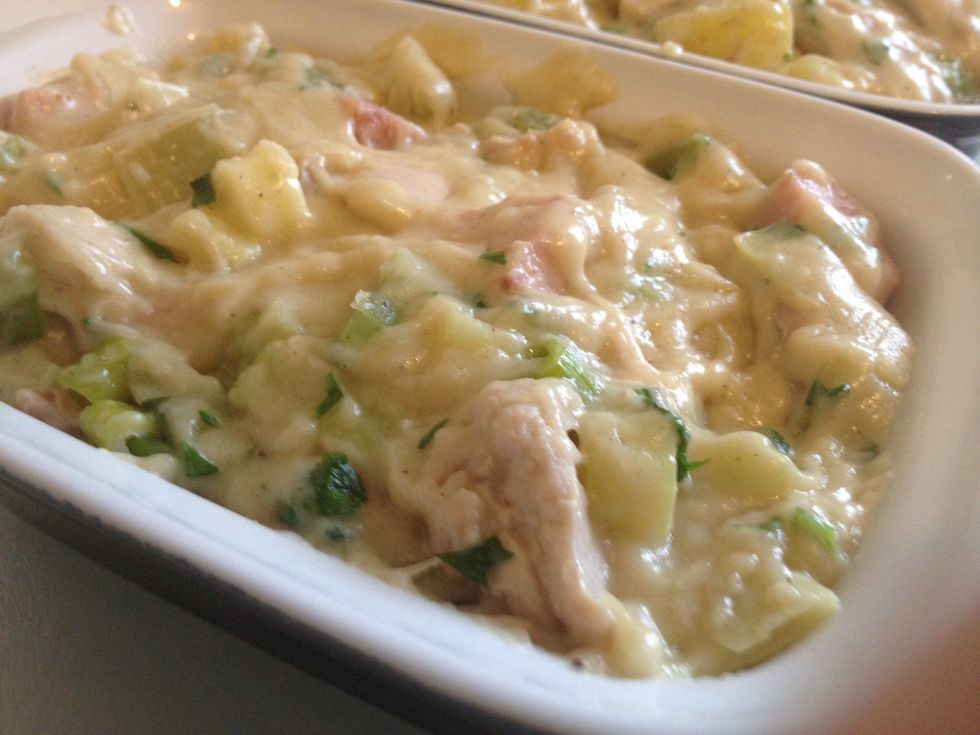 Stir in the cooked chicken and veg and toss gently in the sauce until well coated. Spoon into a oven proof pot. Cool for at least 10 mins, ideally cool compleatly and chill in the fridge.