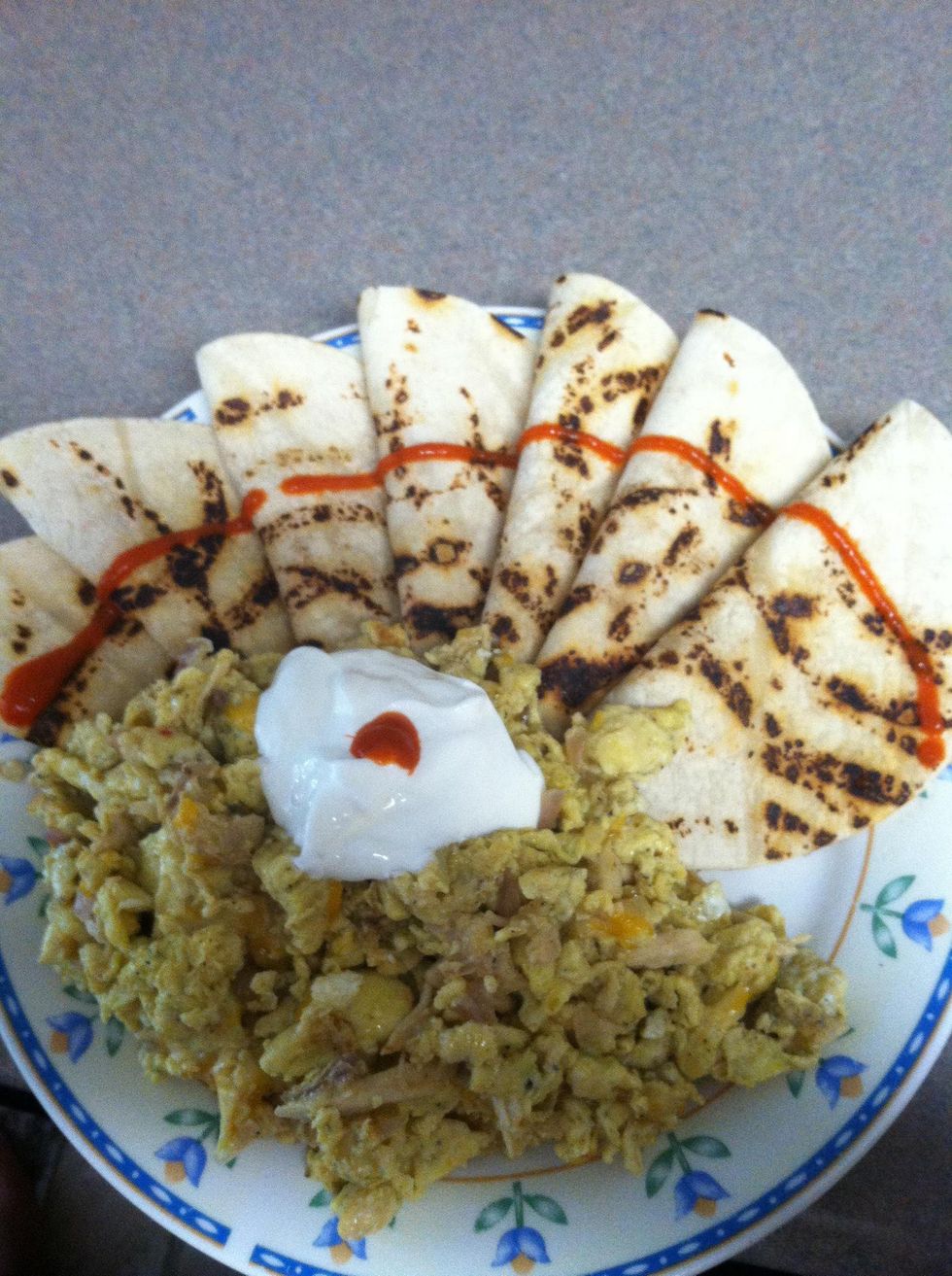 And Voilá!!! Plate up and serve!!! I used siracha and sour cream to garnish. For the tortillas I just toasted them directly on my stovetop for a couple seconds at a time.