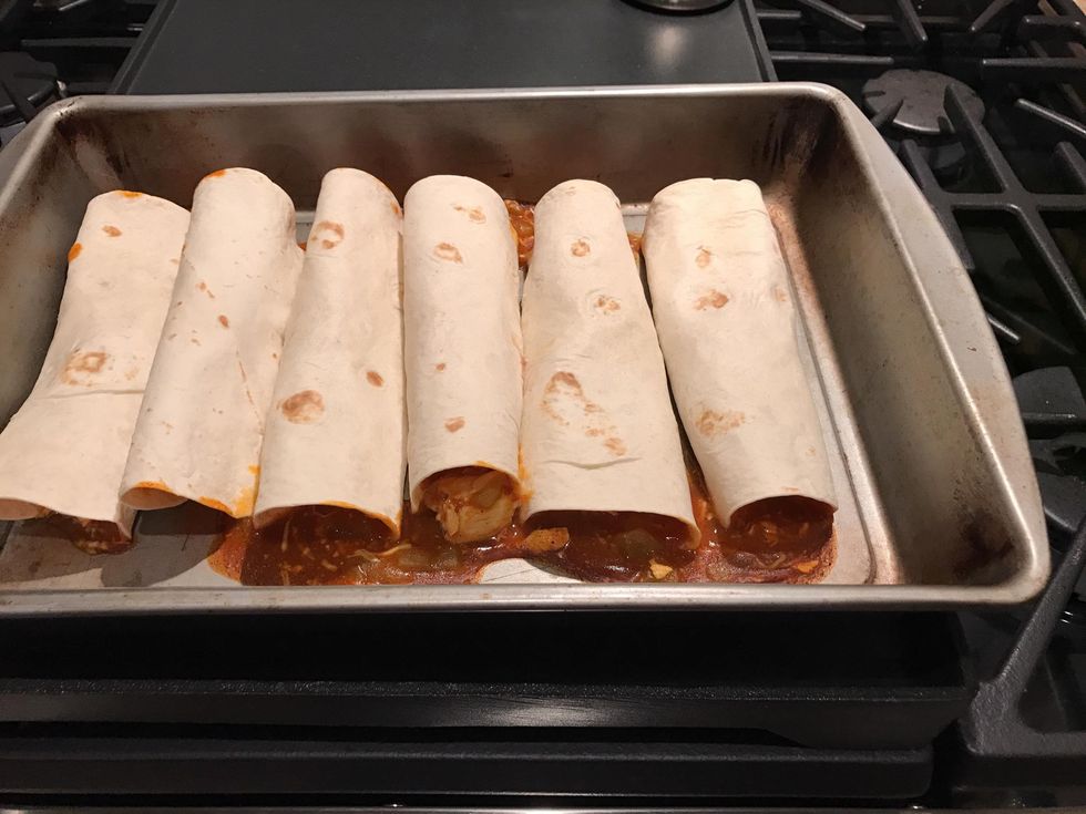 1.0lb Boneless skinless chicken breasts10.0oz Enchilada Sauce1/2oz Chopped green chiles8.0 Tortillas (flour)1.0c Shredded montery jack cheese