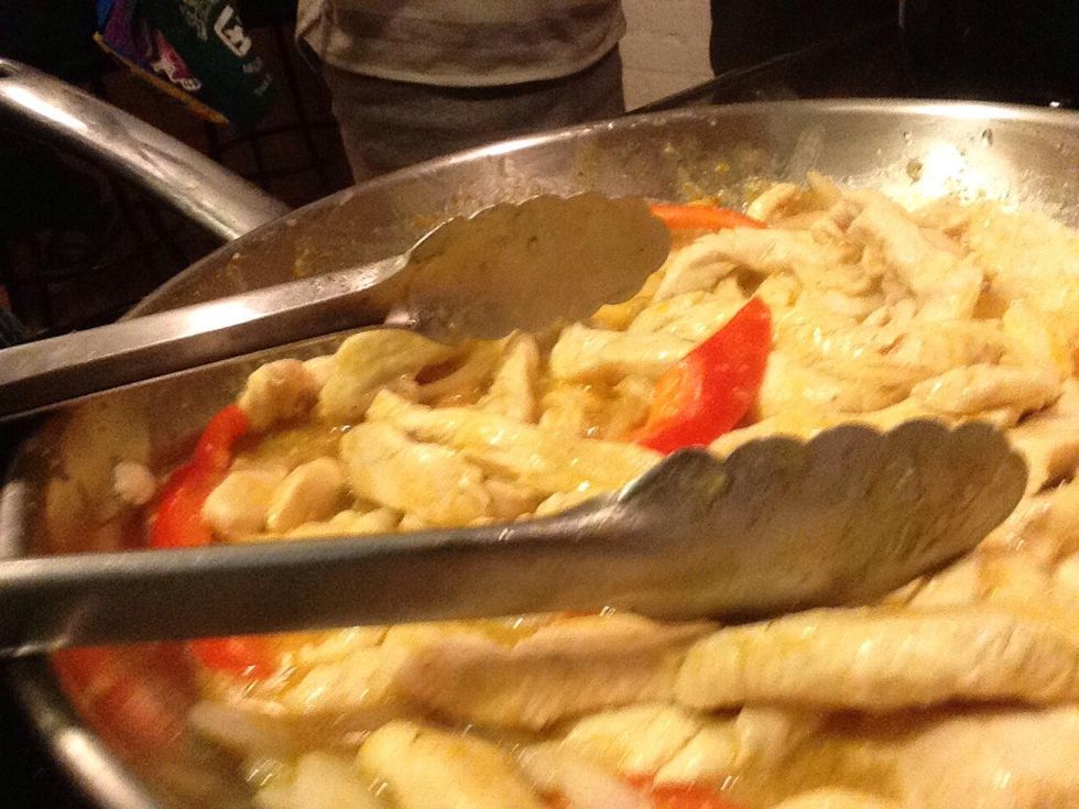 Slice onions thinlySlice red peppers thinlyCut chicken into stripsCook chicken with oil until no longer pinkAdd peppers and onion along with fajita seasoningCook until vegetables are crisp (for about 5 min)