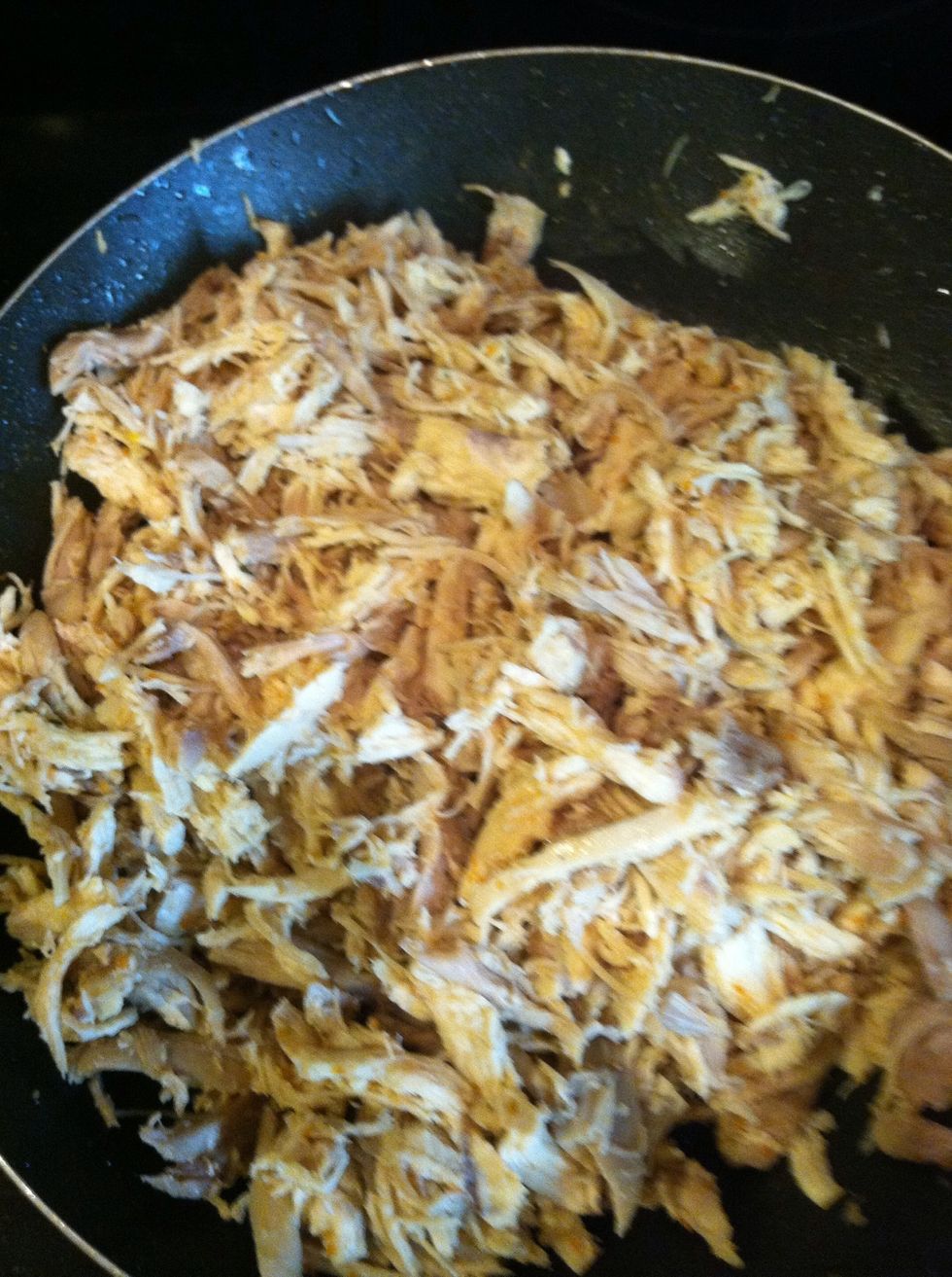 Put shredded chicken in pan.