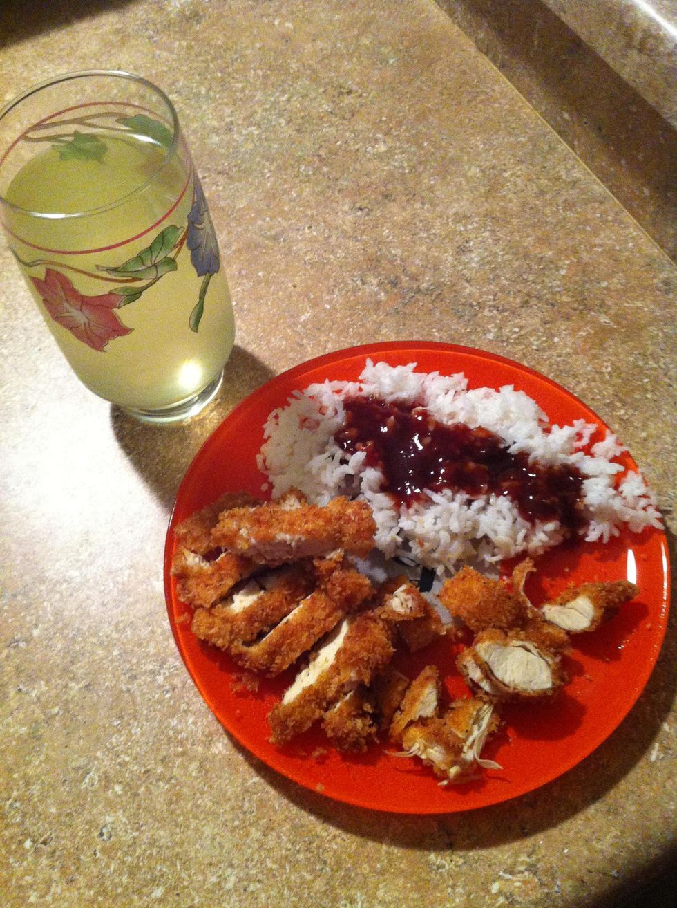 Cut your chicken and add some katsu sauce. Unfortunately, I don't have any so I just poured Kinder's BBQ sauce over my rice.