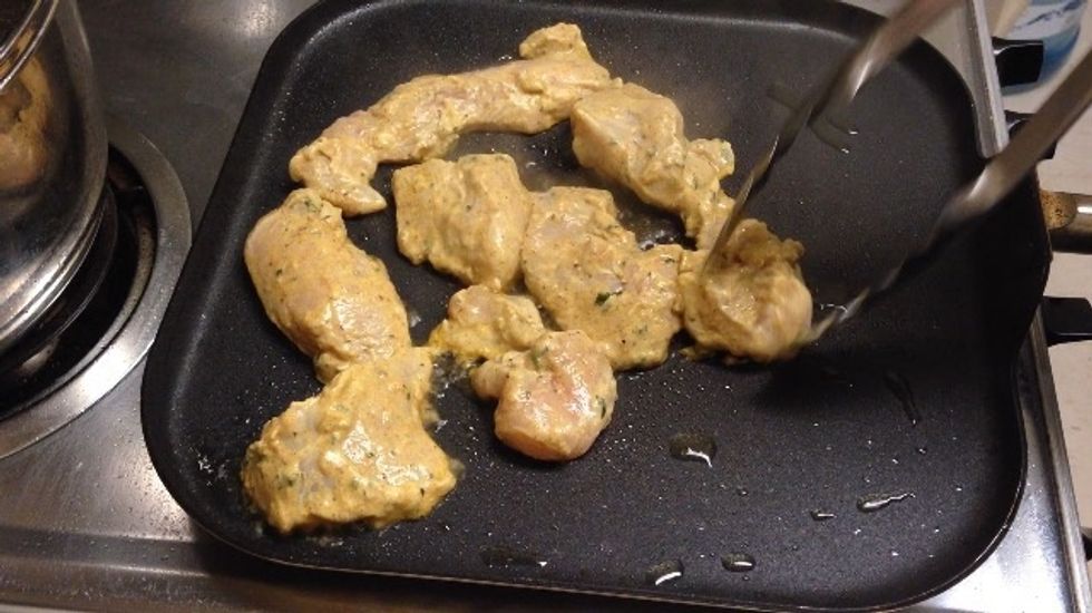 Preheat the skillet over a high heat , drizzle some oil and add chicken