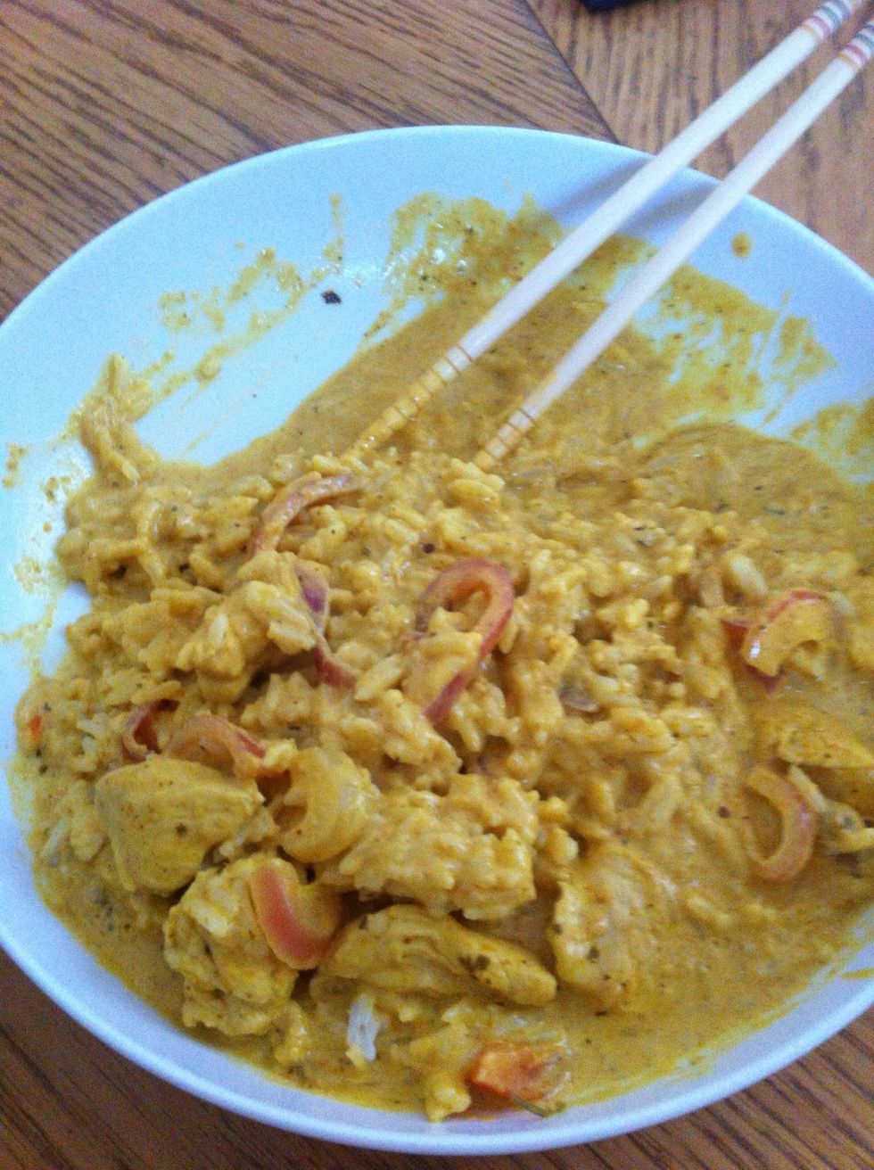 Dish up! I had mixed mine up and eaten some by the time I remembered to take a picture for this! It's an Indian curry, but I use any excuse to eat with chopsticks!
