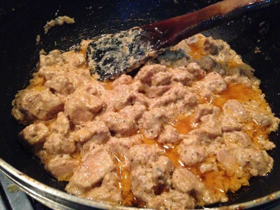 Add boneless chicken pieces to preheated oil in frypan and add ground red pepper according to taste (about 1 tsp)