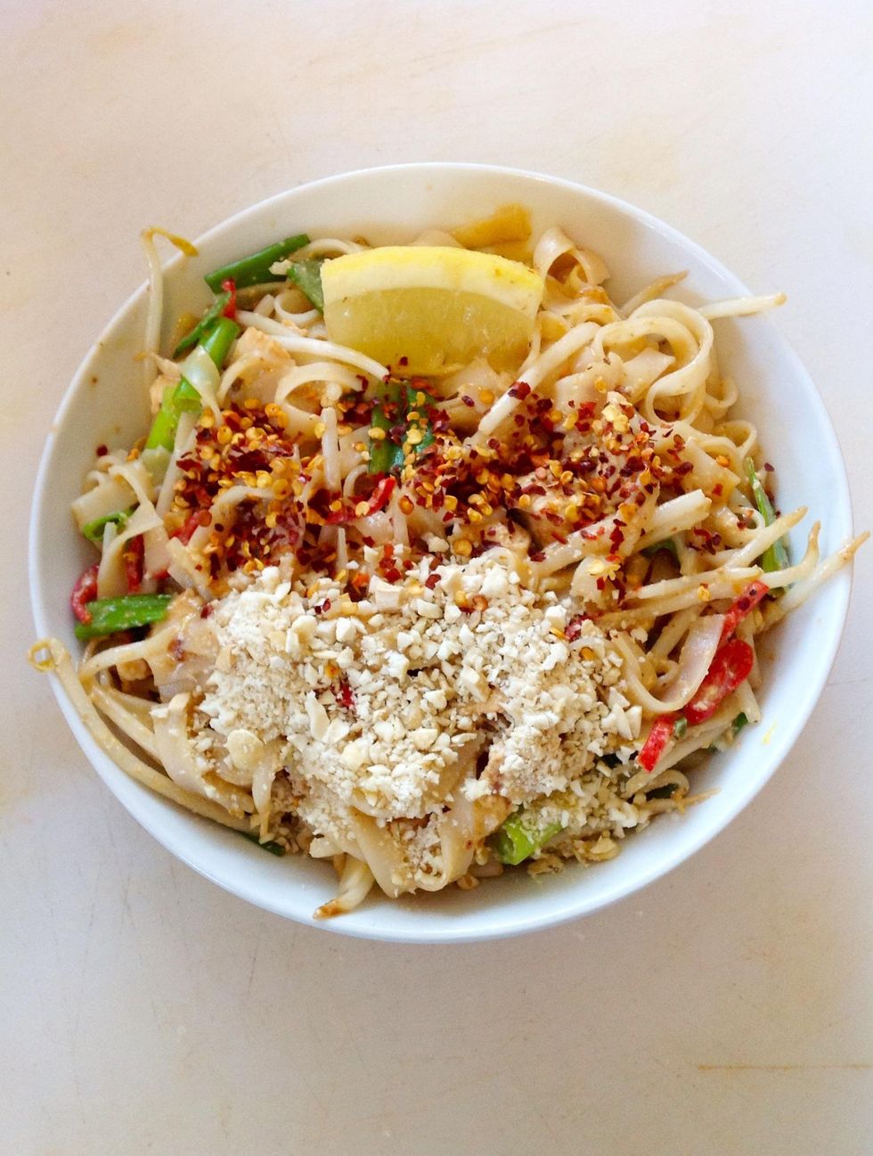 Reduce heat slightly. Add noodles and quickly crack eggs and stir into the noodles - this will stop the noodles sticking. Once stirred, add the spring onions and bean sprouts and turn off heat.