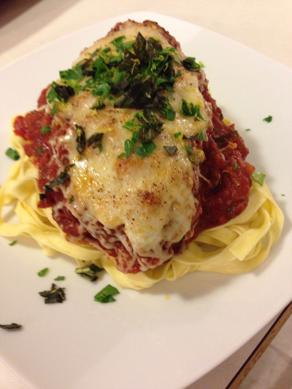 Plate with the pasta, some more sauce top the chicken and finish with the basil/parsley/lemon zest mixture and ENJOY THAT MEAL! Check out my Facebook page! Theloveofculinarycreations Thanks!