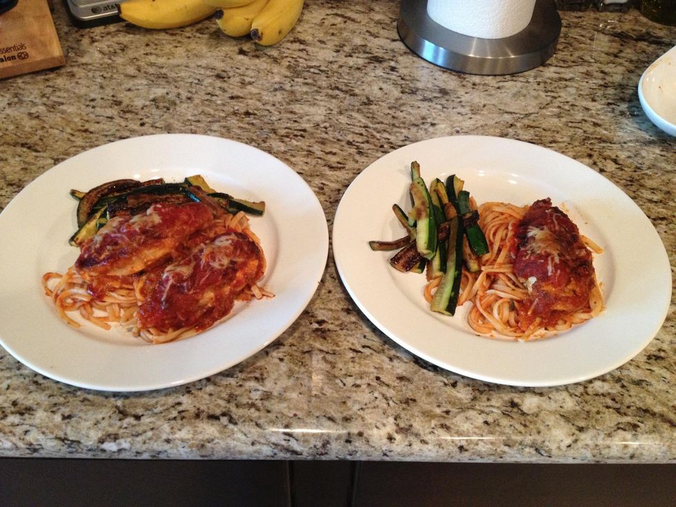 Lay down pasta and top with the chicken and place the zucchini on the side and enjoy!!!