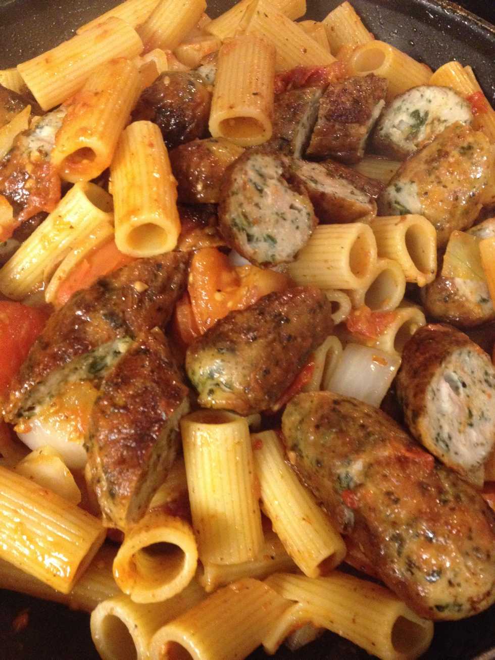 remove chicken sausage from pan and slice them in bite sizes pieces.