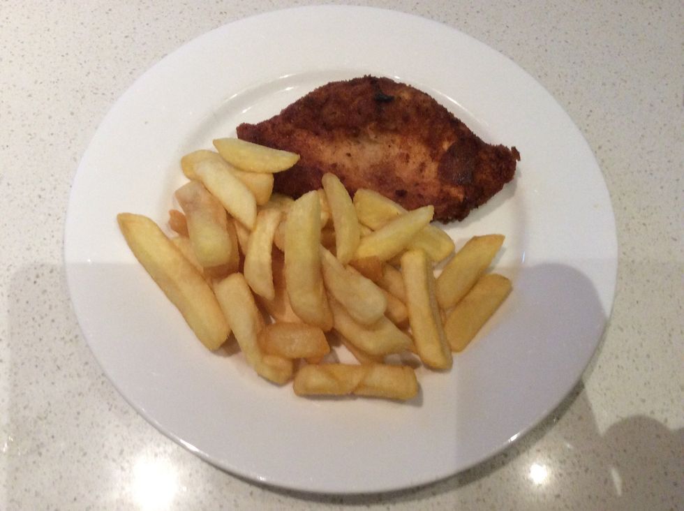 Ingredients 1 large chicken breast 150 g (1 cup) plain flour salt and pepper 1 egg 1 tbsp water 2 cups dry breadcrumbs 500 ml (2 cups) vegetable oil