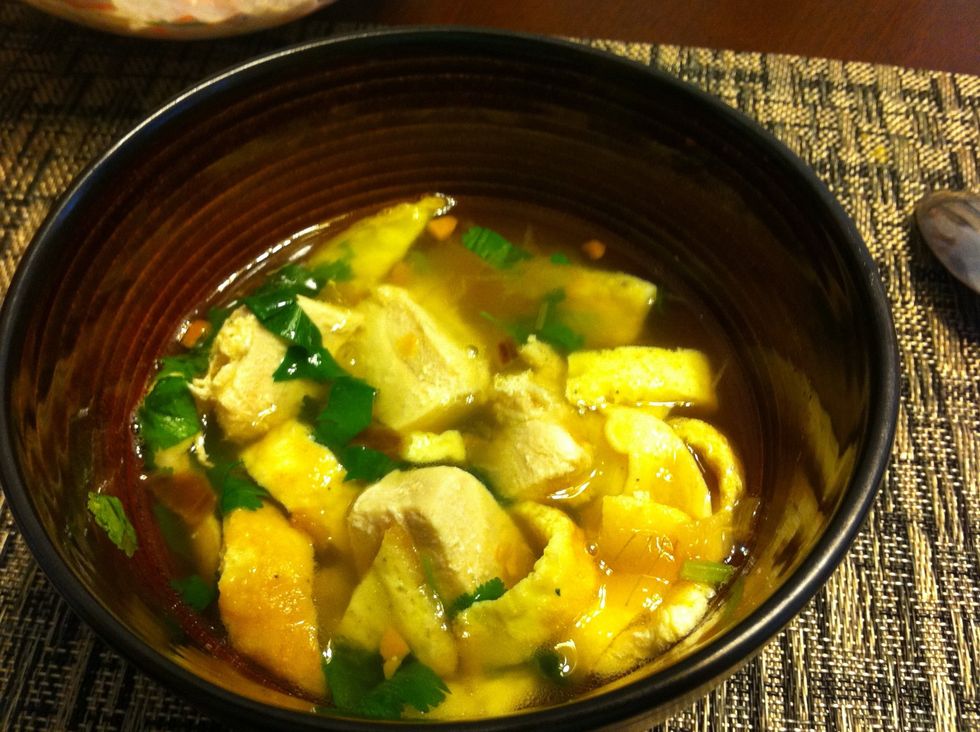 Eggs (each separately) Mix a little salt and black pepper. Pour on a heated,oiled frying pan with olive oil and fry. Turn the egg pancake and fry the other side. Egg pancakes cool and cut into strips.