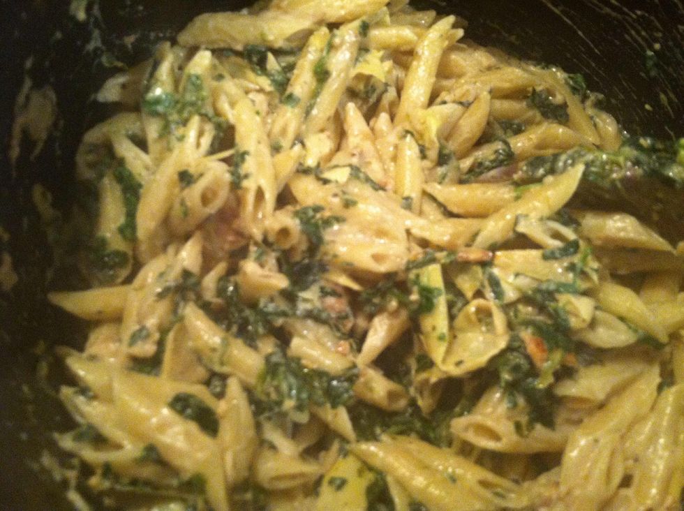 Stir in your set aside prepared goodies: chicken, artichokes, pasta and spinach.