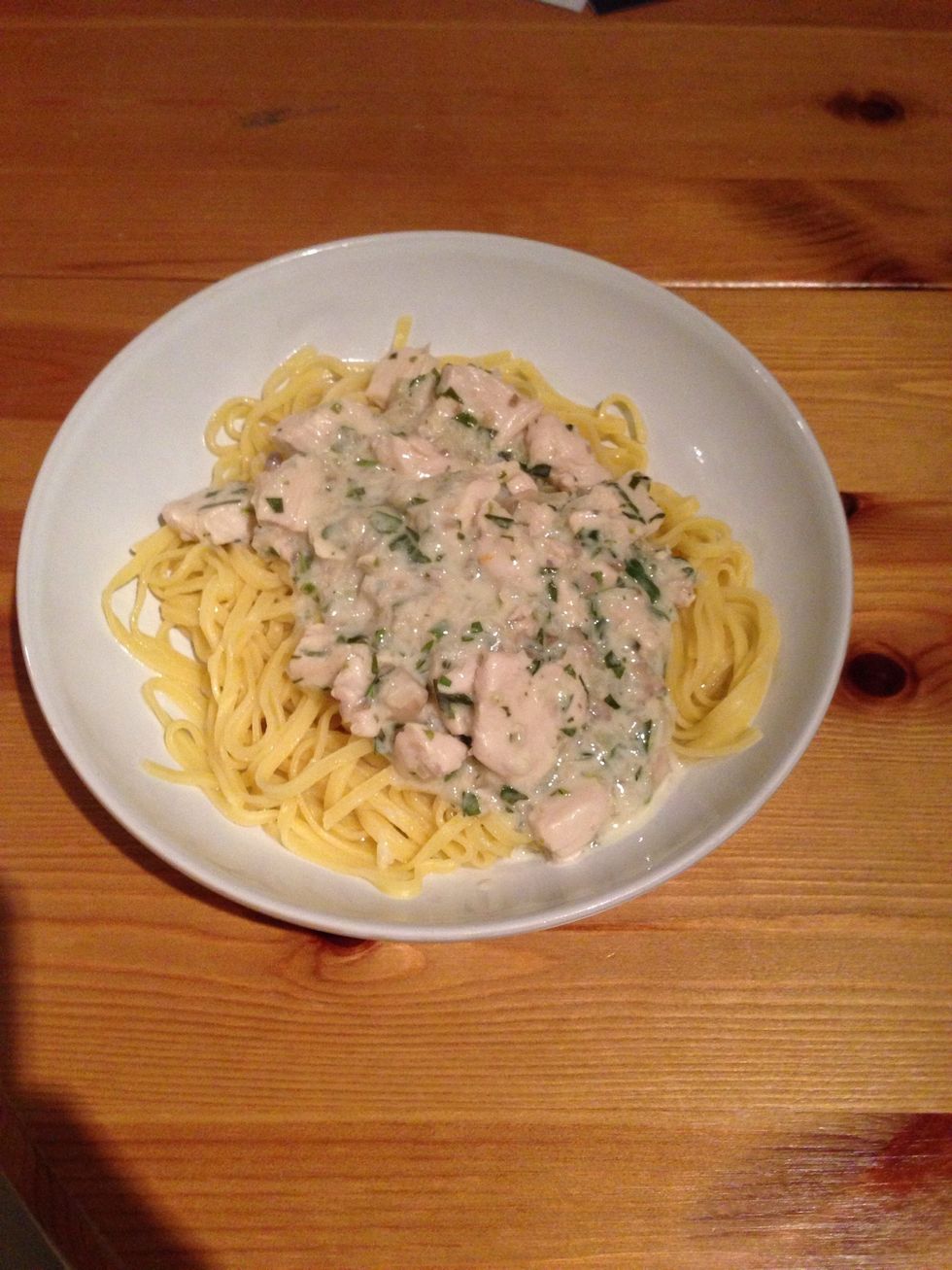Once the alcohol has evaporated, add half a pot of creme fraiche
