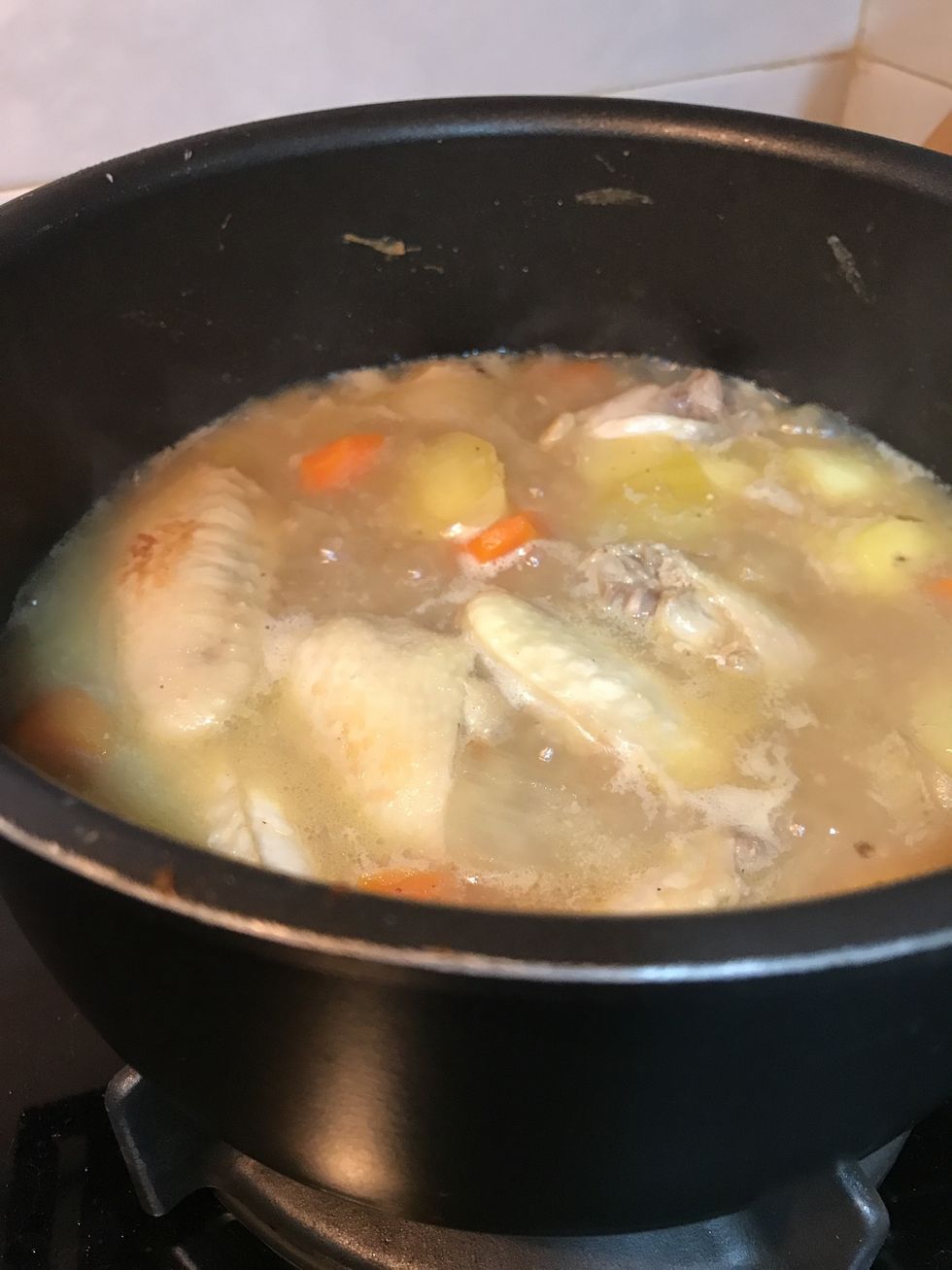 Pick the chicken wings up, brown the onion, carrot & potato in the saucepan