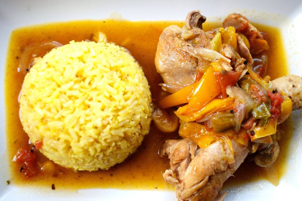 While the chicken is cooking, cook some brown rice with a little saffron. Serve the coconut chicken and peppers with a scoop of rice and broth with the peppers and onions. Enjoy this amazing dish!