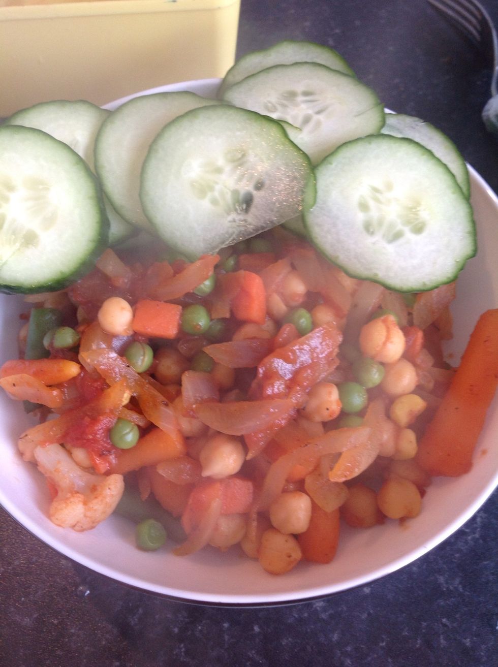 Serve with salad..i only added cucumber but the more the better! You can put it in a tortilla wrap or eat it like this. ONLY 200 CALORIES!!
