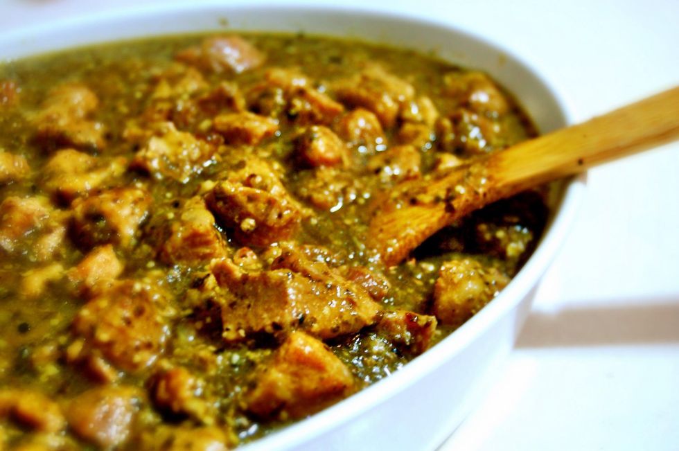 Once pork is browned, add verde sauce, reserved diced potatoes and sliced onions. Add honey and salt to taste. Cover and place into a 250 degree oven for 3 hours or until meat is fork tender.